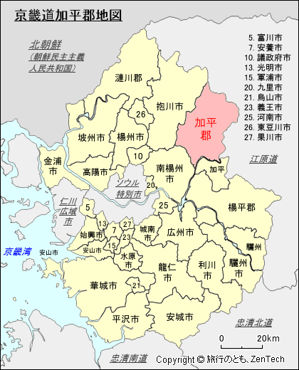 加平郡(カピョン グン、ハングル表記:가평군、英語:Gapyeong City, Gyeonggi)は、韓国・北西部の京畿道にある郡です。加平郡の人口は 61,403人(2015年5月)、京畿道にある28市3郡では 30番目に人口の多い街です。面積 843.26平方キロメートル(325.58平方マイル)です。加平郡の下位行政区画としては、1邑5面(加平邑、清平面、北面、上面、朝宗面、雪岳面)があります。
