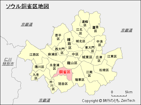 銅雀区(ドンジャク く、ハングル:동작구(トンジャック)、英語:Dongjak-gu, Seoul)は、韓国の首都ソウル特別市を構成する25の行政区の一つで、1980年4月1日に設置(冠岳区から分離)されました。ソウル中南部(漢江南岸沿い)に位置しています。銅雀区の人口は 419,261人(2014年推計)、ソウルでは 14番目に人口の多い区です。面積 16.36平方キロメートル、ソウルでは 22番目に面積の大きい区です。