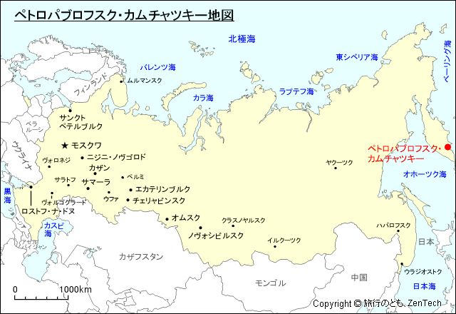 ロシアにおけるペトロパブロフスク・カムチャツキーの場所が判る地図