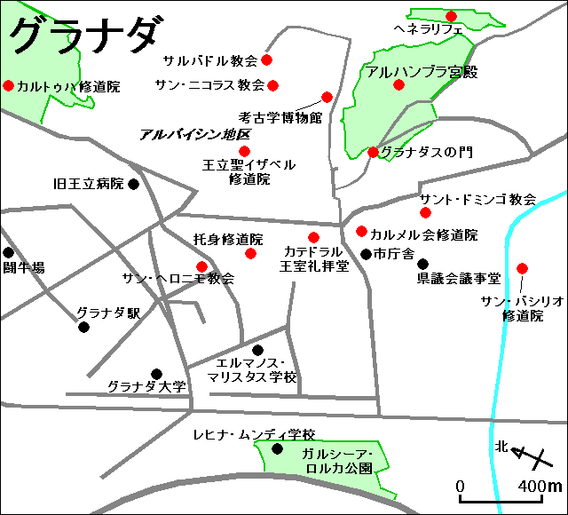 グラナダにある観光名所の場所が判る地図です。このグラナダ地図は、データ改変と再配布を行わない事および出典(引用元)を明記する事を条件に無料かつ自由に利用可能です。著作権は当サイトに帰属します。Webサイトで地図を利用される場合は当サイトへのリンクをお願いします。