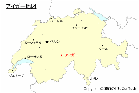 アイガー(Eiger、標高3,970メートル)は、スイス中西部のベルン州オーバーラント地方にあるベルニーズ・アルプス(Bernese Alps)の一峰でスイスを代表する山です。この山域にあるアイガーとユングフラウ(Jungfrau、標高4,158m)およびメンヒ(Mönch、標高4,107m)の三つの山を「オーバーラント三山」と呼んでいます。北側にある高さ1800mの岩壁は「アイガー北壁」として世界的に知られるヨーロッパ三大北壁(アイガー北壁、マッターホルン北壁、グランド・ジョラスのウォーカー側稜)の一つです。