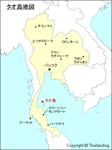タオ島の地図です。タオ島(Ko Tao)は、タイ南部のスラーターニー県にある島です。このタオ島は、アジア屈指のダイビングスポットとして有名な島です。島の中心となっている集落はメー・ハート(Mae Hat)で、サムイ島からの船がメー・ハートの港に到着します。