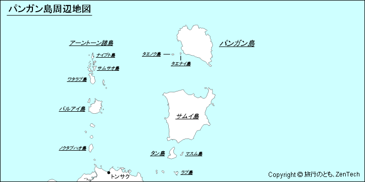 パンガン島の地図です。パンガン島(Koh Phangan)は、タイ南部のスラートターニー県にあるパンガン島郡を構成する島です。パンガン島は、サムイ島から北へ約25キロメートルの場所に位置しています。