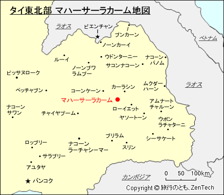 タイの首都バンコクからナコーンラーチャシーマーを経由してマハーサーラカームまで車で 6時間50分(北東へ道なりで 480km)、ナコーンラーチャシーマーから車で 2時間55分(北東へ道なりで 220km)、コーンケーンから車で 1時間20分(東南東へ道なりで 75km)です。マハーサーラカームからローイエットまで車で 45分(東南東へ道なりで 41km)、カーラシンまで車で 50分(北東へ道なりで 46km)です。