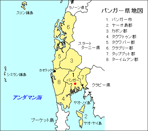 パンガー県( จังหวัดพังงา , Phang Nga Province )は、タイ南部にある県です。パンガー県は、ラノーン県とスラートターニー県とクラビー県に接しています。パンガー県の西側はアンダマン海に面し、南側には海を挟んでプーケット県があります。
