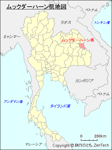 ムックダーハーン県(タイ語:จังหวัดมุกดาหาร、英語:Mukdahan Province)は、タイ東北部にある県です。ムックダーハーン県は、アムナートチャルーン県、ヤソートーン県、ローイエット県、カーラシン県、サコンナコーン県、ナコーンパノム県と接し、東側はメコン川が流れラオスとの国境になっています。