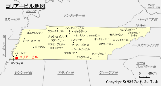 テネシー州におけるコリアービルの位置が判る地図