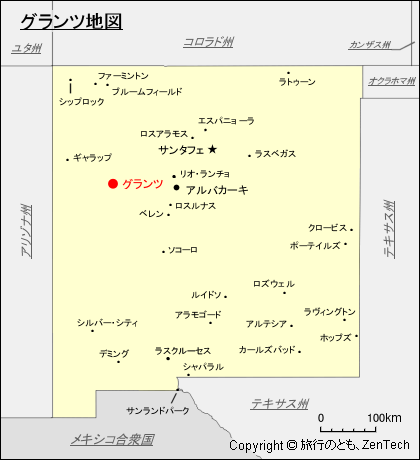 ニューメキシコ州におけるグランツの位置が判る地図