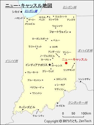 インディアナ州におけるニュー・キャッスルの位置が判る地図
