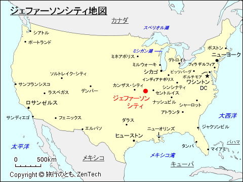 ミズーリ州の最大都市カンザスシティ からジェファーソンシティまで車やバスで 2時間21分(東南東へ道なりで 157マイル = 251km)、ジェファーソンシティからセントルイス まで車で 2時間3分(東へ道なりで 133マイル = 213km)です。