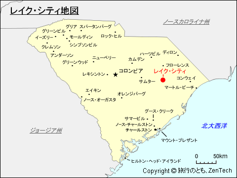 レイク・シティ(Lake City, South Carolina)は、アメリカ合衆国南部のサウスカロライナ州東部フローレンス郡にある都市です。人口 6,675人(2010年国勢調査)です。レイク・シティ市内には、アメリカ国道 52号線/378号線(U.S. highway 52, 378)およびサウスカロライナ州道 341号線(South Carolina State Highway 341)が通っています。州都コロンビアからレイク・シティまで車やバスで 1時間33分(東へ道なりで 79.0マイル = 126km)です。レイク・シティから郡庁所在地のフローレンスまで車で 33分(北へ道なりで 24.0マイル = 38.4km)です。