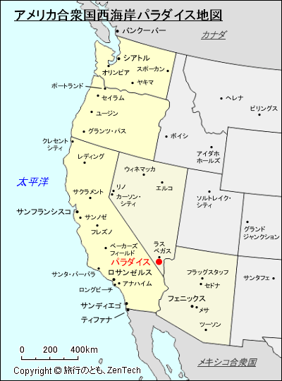 アメリカ合衆国西海岸におけるパラダイスの位置が判る地図