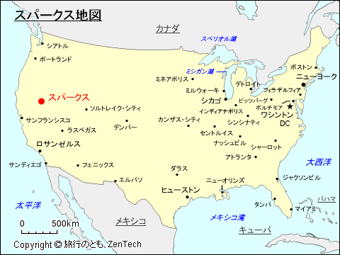 アメリカ合衆国西海岸におけるスパークスの位置が判る地図