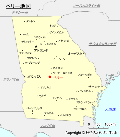 ペリー(英語:Perry, Georgia)は、アメリカ合衆国 南東部のジョージア州 中央部のハウストン郡とピーチ郡に跨る都市(シティ)で、ハウストン郡の郡庁所在地となっています。ペリーの人口は 20,624人(2020年国勢調査、2010年国勢調査では人口 13,839人)、ハウストン郡ではワーナー・ロビンズ に次いで 2番目、ジョージア州では 49番目に人口の多い街です。面積 26.18平方マイル(67.80平方キロメートル)です。