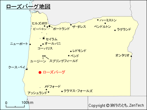 アメリカ合衆国西海岸におけるローズバーグの位置が判る地図