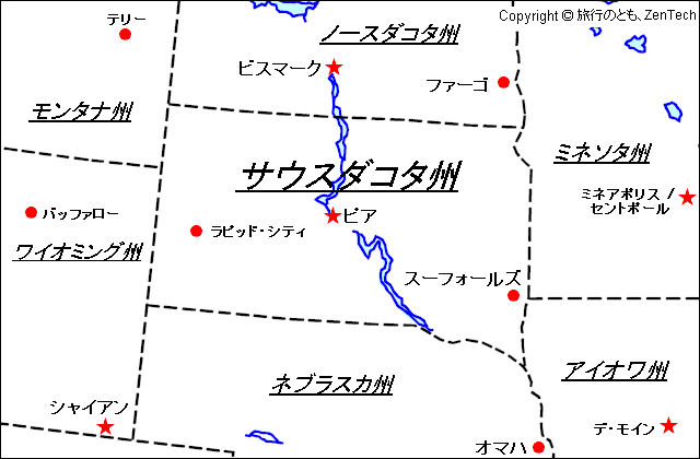 アメリカ中北部にあるサウスダコタ州の地図です。州都ピア やスーフォールズ など主要都市の場所や隣接する州が判ります。