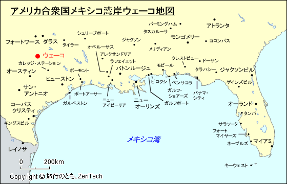 アメリカ合衆国メキシコ湾岸におけるウェーコの位置が判る地図