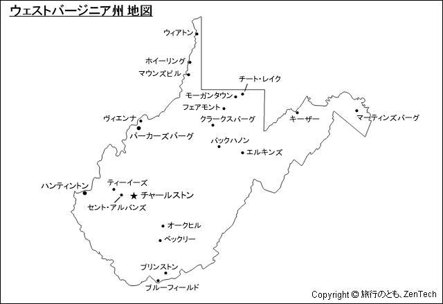 アメリカ東部にあるウェストバージニア州の地図です。州都チャールストンや主要都市の場所や隣接する州が判ります。